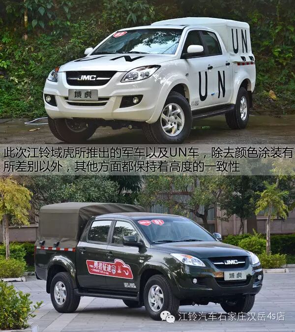 此次江铃域虎所推出的军车以及UN车,除去颜色涂装有所差别以外,其他方面都保持着高度的一致性,所以在此我们就不分别一一进行介绍了,不过个人看来,UN车型相比军车来说,无论是外在的整体还是细节,都要显得更加抢眼。