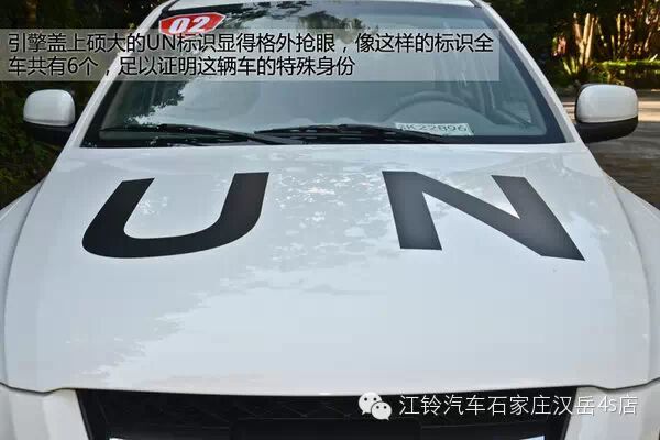 UN车型全车共有6个部位都贴有身份标识,乍一看似乎显得有些重复,但作为一辆联合国用车,处处能够彰显自己的特殊身份才是它所需要的,毕竟与纯绿色的军车相比,白色涂装的UN车显得要低调很多。
