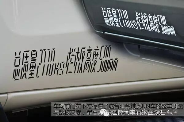 车辆前门左下方标注了这台江铃域虎UN车的整车质量与踏板高度,军车版本数据与UN车保持一致,由于车身较大的缘故,对于身材不够魁梧的消费者来说,即使使用踏板上车也会稍显吃力,所以此时踏板的配置就显得格外重要了。