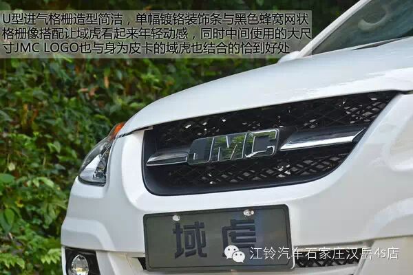 U型进气格栅造型简洁,单幅镀铬装饰条与黑色蜂窝网状格栅像搭配让域虎看起来年轻动感,同时中间使用的大尺寸JMC LOGO也与身为皮卡的域虎也结合的恰到好处。