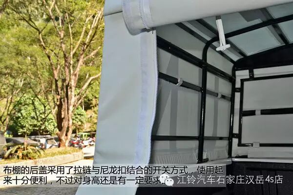 转到尾部,加装的布质后棚是这两款特装车与民用车型相比区别最大的地方,UN车型在后棚的两侧以及后方,都印有UN标致,同时后方采用了拉链与尼龙扣结合的开关方式,使用起来十分便利,打开后棚之后,我们可以发现在内部用来支撑布棚的铁架,从条幅数量以及粗度来看,铁架的牢固程度还是比较可靠的。
