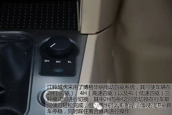 江铃域虎采用了博格华纳电动四驱系统,其可使车辆在2H(两驱)、4H(高速四驱)以及4L(低速四驱)三种模式间进行切换,其中2H与4H之间的切换在行车期间便可轻松完成,但如果想挂入4L的话,驾驶员需要将车停稳,同时踩住离合器再进行操作。