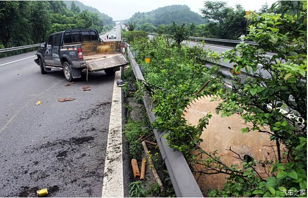 高速路上哪来的圆盘锯?市高速执法一支队六大队执法人员到场后,发现肇事者是对向车道的另一辆皮卡。当时,这辆牌照为渝B627××的皮卡车,载着机器设备从巴南前往綦江,突然失控撞向分隔带。车上圆盘锯因固定不牢,连同锯片支架一起飞出货箱。三四块大型圆锯飞入分隔带内,还有一块圆锯则弹入对向车道,切进向先生的皮卡车头。