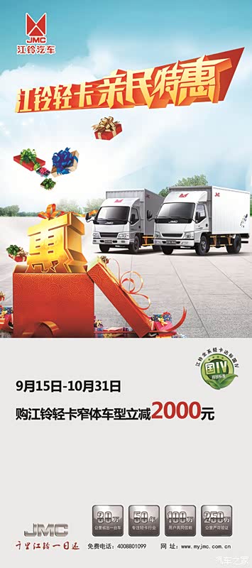自2015年9月15日-10月31日,购买江铃轻卡窄体车型,立减2000元!江铃凯运助您财运滚滚!