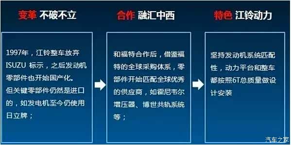 而在之后与福特的合作中,江铃借鉴福特的全球采购体系,零部件开始匹配全球优秀的供应商,同时坚持发动机系统的匹配性,并且动力平台和整车依然都是按照6T总质量做设计安装,发动机可靠性强。