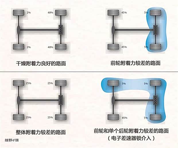 多片离合器式差速器主要是通过湿式离合片产生差动扭矩,而离合器的压紧与分离是靠电子系统来控制的。车辆在正常行驶时,驱动形式为前驱,如当系统检测到车轮打滑时,通过电子系统控制离合器压紧,进而将部分动力传递至后轮,理论上电脑会根据车速与路况在100:0-50:50之间自动分配前后轴扭矩,以达到抓地性能最优化。