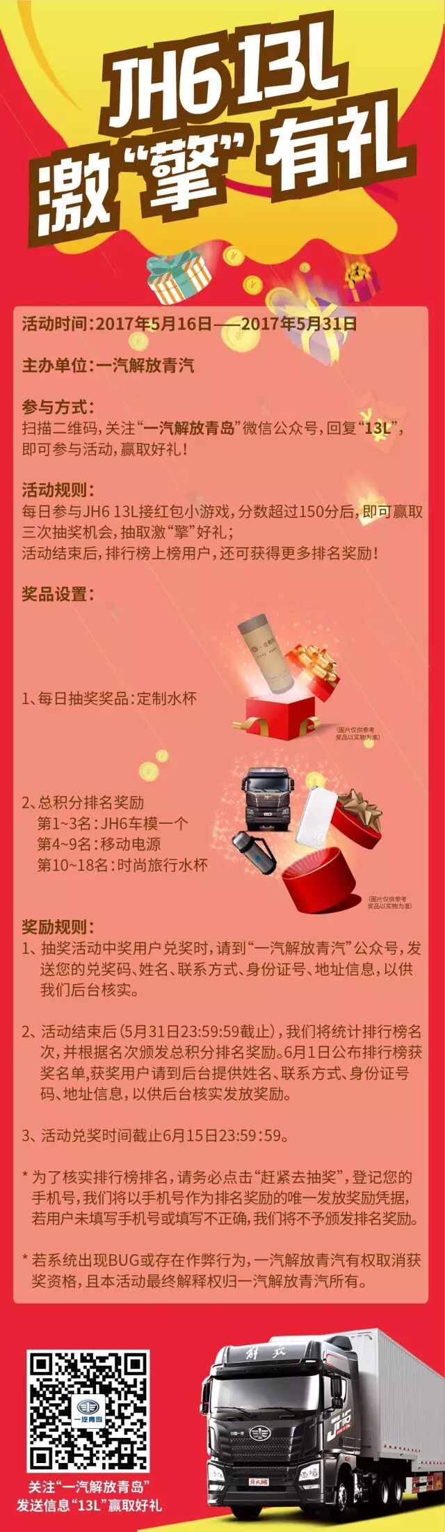 长按图片识别二维码,关注“一汽解放青岛”,发送信息“13L”即可参与活动赢取好礼~~