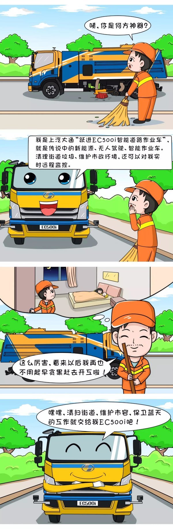 针对城市环卫的使用痛点,上汽大通联合上海市路政局以及国内顶尖环境装备企业,开发了L4级智能道路纯电动作业车——EC500i