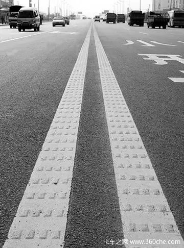 行车道中凹凸的白色标线为震荡标线,主要提醒司机有弯道、下坡等路段。