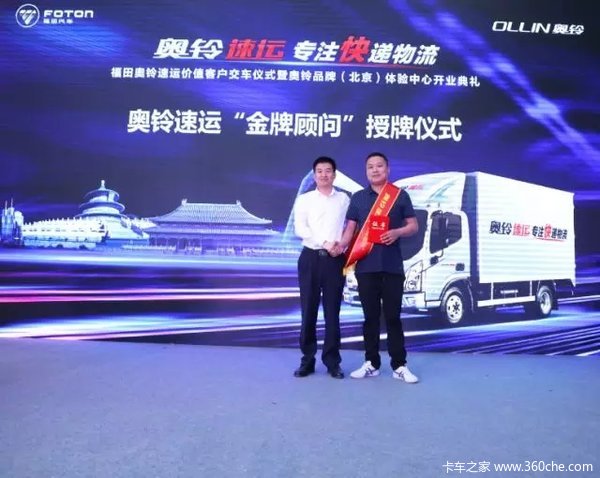 活动当天,福田汽车集团及轻型商用车车事业部相关领导与福田奥铃价值客户、经销商以及行业主流媒体近百余人汇聚一堂,共同见证福田奥铃迈向新的征程。创新实践“零界分销”,与北京卡车驿站科技服务有限公司、北京跨越速运有限公司共同完成了奥铃速运的交车仪式,并向第2001名奥铃速运用户授予“金牌顾问”称号。同时还发布了“福田奥铃七星服务”标准,并举行奥铃品牌(北京)体验中心剪彩仪式。福田奥铃正式吹响了服务升级变革、专注快递物流的冲锋号,在中高端轻卡激烈竞争中占得先机。