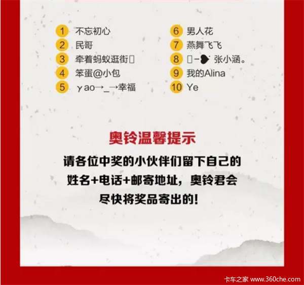 当前位置: 卡车之家 >卡车经销商 > 杭州大容汽车销售服务 > 促销新闻 > 【中奖名单公布】奥铃喊你领奖了