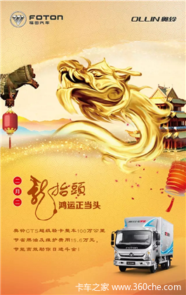 二月二龙抬头,中国民间普遍认为在这一天剃头,会使人鸿运当头、福星高照。福田奥铃CTS超级轻卡节能高效让你同样鸿运当头,配备EBP节油开关,整车100万公里节省燃油及维护费用15.6万元,祝你鸡年财源滚滚来。