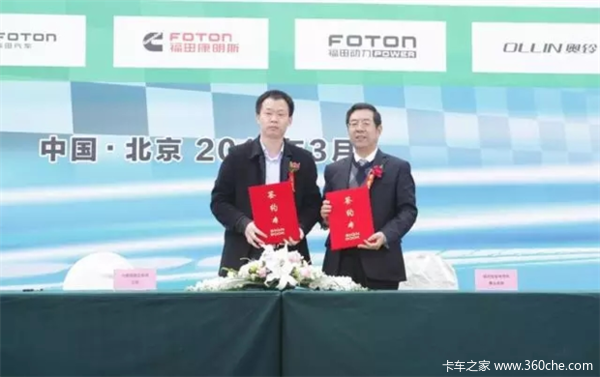 (福田商用汽车集团奥铃业务副总监、轻型商用车事业本部副本部长何增礼先生和北京三元牛奶有限公司的总经理程华先生代表双方签约)