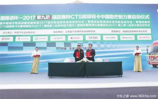3月25日,在图雅诺杯--2017(第九届)福田奥铃CTS超级轻卡中国勒芒耐力赛启动仪式现场,在数百位嘉宾、媒体及客户代表的见证下,福田奥铃与北京三元牛奶有限公司和今麦郎面品有限公司分别签署超过1000辆福田奥铃CTS超级轻卡、与北京桑德新环卫投资有限公司签署1000辆奥铃T3微卡战略采购合作协议。