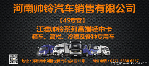 【卡车之家】河南帅铃汽车销售有限公司 经营品牌:江淮帅铃 公司地址:郑州市新郑市郭店镇107国道与黄金大道交叉口东南角弘鑫汽车城