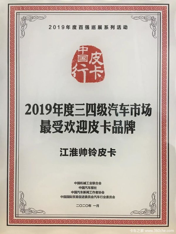 江淮皮卡通过技术与配置升级,深化了其宜商宜家的特性,对我国三四级汽车使用的用户而言,是实用高效的事业搭档,获“2019年度三四级汽车市场最受欢迎皮卡品牌”称号,江淮皮卡实至名归!