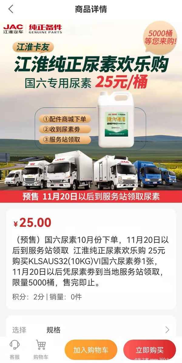 参与方式:在江淮卡友APP--配件商城—尿素专区,点击20元购活动链接抢购,凭APP发送的优惠券前往任意江淮授权的服务网点进行核销领取。