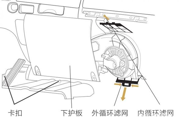 6、车辆每行驶5000~10000公里时(具体根据使用环境确定),更换或清洗鼓风机过滤网一次,以免影响空调的通风量和制冷制热效果