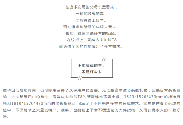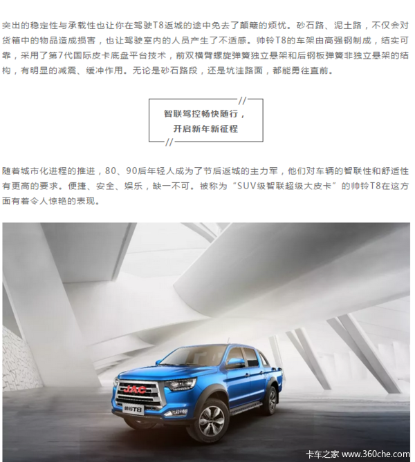 T8驾驶室内配置了360°全景影像系统和倒车雷达,身处驾驶室内也能轻松了解车周路况。LDW车道偏离预警、博世9.1版ESP系统和胎压监测也都能极大的提高行车安全性。更令新一代用户满意的是,T8配置的“J-ConNet2.0”车联网智能系统可通过远程控制、大数据分析等技术让使用者对车况了然于胸;CarLife 手机互联系统也增强了T8的娱乐性,让驾车返城的过程升级成为一次充满了科技感与娱乐趣味的时尚体验之旅。