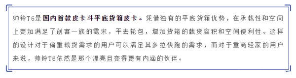帅铃T6平底货箱皮卡在增加其工具性的同时,采用了同步国际领先技术的高效发动机,拥有102kW最大功率和320N·m最大扭矩的数据表现,在同类型皮卡中,能达到这一动力数据的发动机屈指可数。