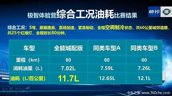 在驾控体验赛中,做饮品运输的余师傅驾驶帅铃全能城配版在全程空调制冷、车辆自重加货物总质量为4.5吨状态,经过S弯道、颠簸路面、直线加速、紧急制动环节,60公里城郊道路,25 个红绿灯的综合工况下,综合油耗值显示为百公里油耗11.7L。