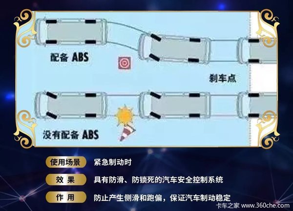 ABS系统的最大作用,就是在制动过程中缩短刹车距离,从而保持车辆稳定性。如果没有ABS,在光滑的路面刹车时,便很容易发生侧滑、甩尾甚至翻车!而江淮轻卡配备了高铁同源的克诺尔ABS,可让卡哥们在紧急制动时,仍能轻松掌控方向!