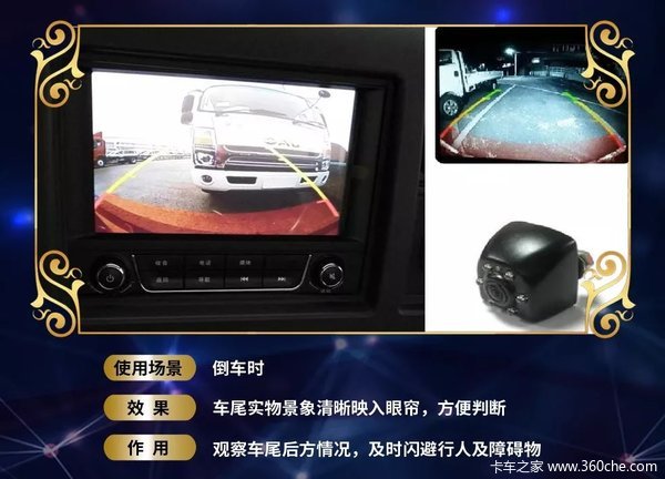江淮轻卡的安全细节,除倒车雷达之外,还配备倒车影像系统。将车后状况清晰显示于中控屏上,随后可准确掌握后方路况,让倒车如前进般自如。此“卡牌”还可用于各时段,即使在夜晚,也能通过配有照明的倒车雷达,将路况看清。
