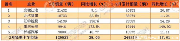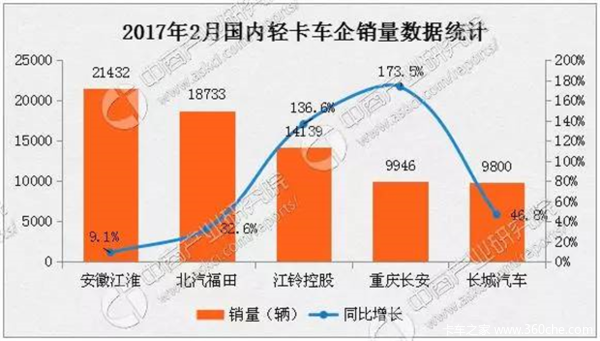 2017年2月轻型卡车企业销量排名第一的是安徽江淮为2.1万辆,1-2月累计销售40953辆,同比增长20.87%。其中旗下江淮康铃1-2月累计销售1.2万辆,同比增长31.7%。