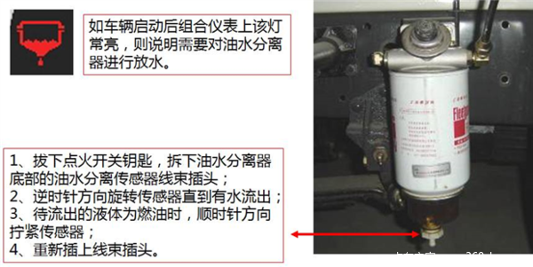 如果燃油系统进入水分,容易引起高压油泵、喷油器损坏或失效!国五发动机的ECU检测到燃油系统水分过量时,会点亮组合仪表上的燃油含水报警灯,提醒用户及时放水,如未及时放水则ECU限制发动机扭矩输出,直接影响车辆的正常行驶!