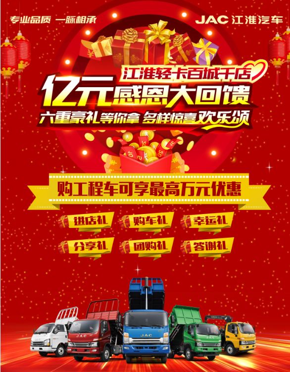 “江淮轻卡百城千店亿元感恩大回馈”活动全国火热进行中,六重豪礼等你拿,多样惊喜欢乐颂......