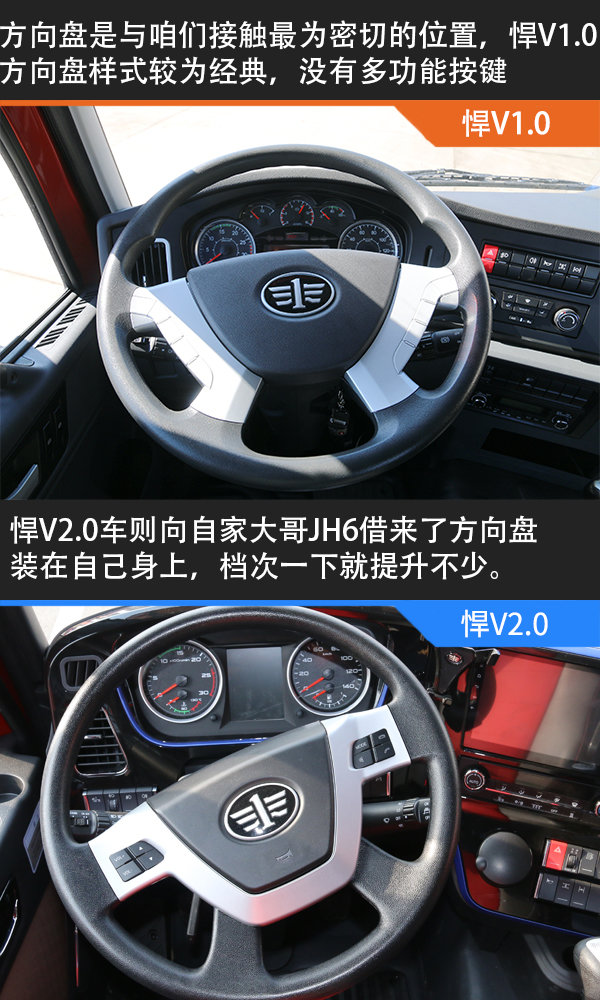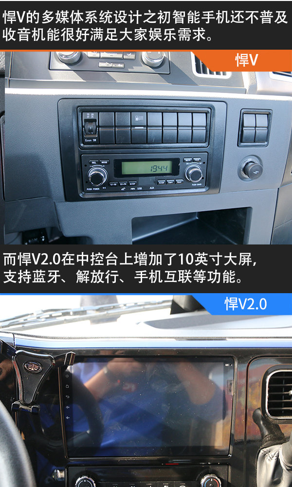 悍V内饰可以说经久不衰,可在这么多年摸爬滚打中,也会稍显一些不足,为此一汽解放青汽充分接受用户建议,并在悍V2.0版本上做出提升!