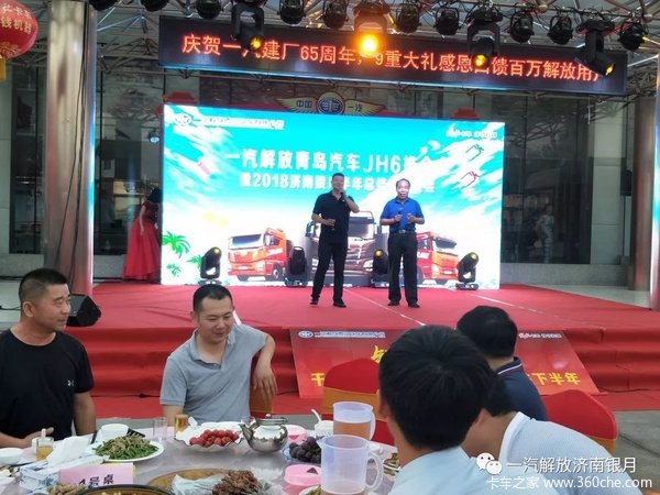 济南银月总经理尹鹏先生出席晚会现场致辞。尹总首先向莅临现场的一汽解放各级厂家、商代处领导以及到场的大客户们表示热烈的欢迎的和衷心的感谢,尹总举杯庆祝济南银月2018上半年销量突破1100台大关,同时向2018年下半年新的销售、售后产值目标宣战,济南银月全体员工将坚持以客户为中心,以奋斗者为本,众志成城、砥砺同行,向着实现下半年新车销售700辆,维修全年过千万的目标前进。