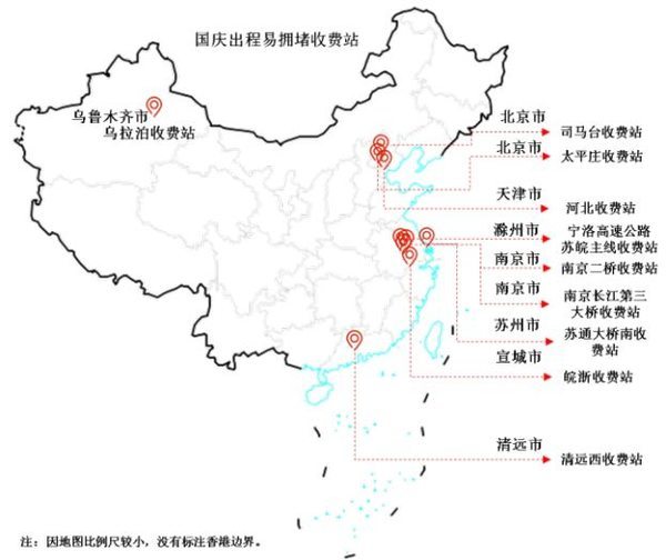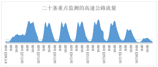 国庆期间,以下二十条重点监测的高速公路交通量始终处于较高水平,明显高于平日交通量。