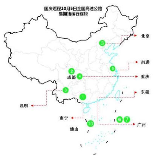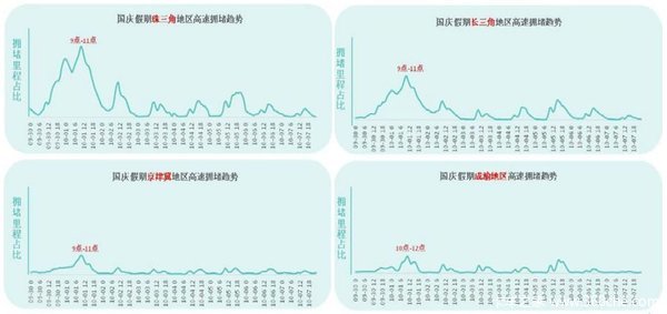 ?珠三角地区、长三角地区、京津冀地区10月1日9点-11点为拥堵峰值,成渝地区10月1日10点-12点为拥堵峰值;返程较为分散,拥堵返程峰值出现在10月5日。