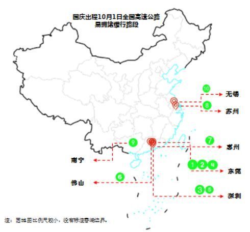 ?国庆假期,车流量较大的路段集中于长三角地区、珠三角及京津冀地区的主干高速,如沈海高速上海段、浙江段、广 东段,沪昆高速湖南段、浙江段,京沪高速北京段、河北段, 青银高速山东段,京港澳高速湖南段等路段。