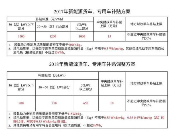 2018年新能源货车、专用车补贴方案的三个档次补贴标准相比2017年全面下调,分别变为900元/kWh、750元/kWh、650元/kWh。单车补贴上限由15万元调整为10万元。