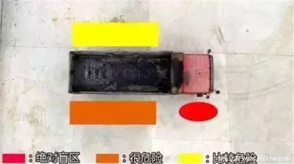 货车盲区货车右侧盲区约在货箱末端至驾乘舱末端位置,且距离货车宽度约为1.5米的范围,货箱越大盲区越大。