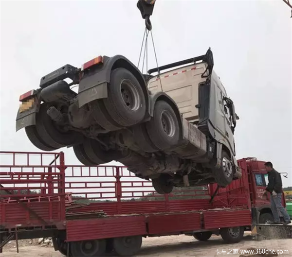 肇事车运输时的照片,从侧面看去驾驶室侧面和后面未发现变形痕迹。