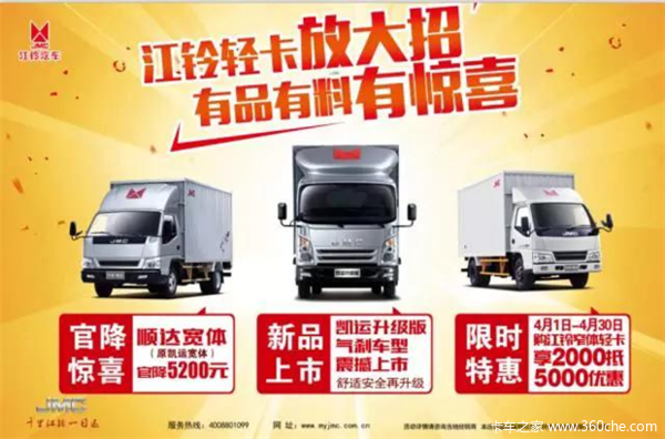 此外,江铃轻卡优惠也在持续进行中,顺达宽体官降5200,顺达窄体2000抵5000限时优惠,帮你早一步实现梦想,成为人生赢家!
