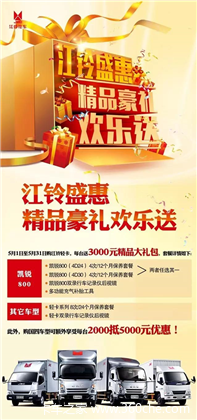 当前位置: 卡车之家 >卡车经销商 > 盐城福顺江铃汽车销售服务 > 促销新闻 > 缤纷五月天 ,江铃豪礼欢乐送!