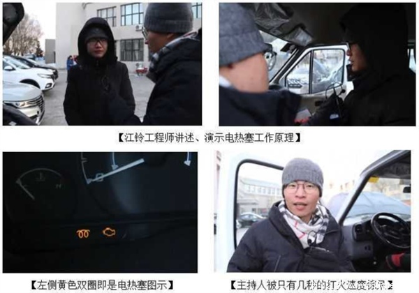然而,在零下近30°的极低气温下,这款江铃品牌轻客仅需短短十几秒预热就迅速启动,究竟有什么法宝?“关键是要让发动机快速升温”,来自江铃的工程师一语道破玄机。一旦发动机的温度在合适的范围,那启动自然就会更为快速。为了达到这样的效果,江铃的工程师动用了大智慧,为发动机配备了一个名为电热塞的装置。插入钥匙上电后,电热塞里的电阻丝就会迅速升温至600到900摄氏度,像“暖宝宝”一样给燃烧室加热,即便是测试时零下28°的严寒环境中,气缸内燃油的粘度也会大大降低,让启动过程迅速平稳。