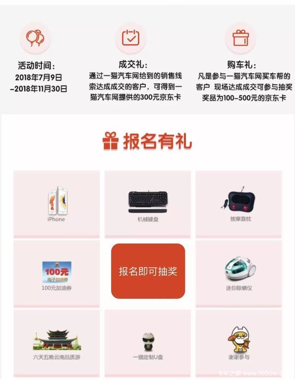 凡在活动期间,通过一猫汽车网报名、成交的顾客,即可参与抽奖,多重丰厚大奖等你来拿!