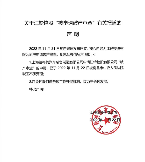 不过,江铃控股很快于11月22日就发表了“关于江铃控股‘被申请破产审查’有关报道的声明”,声明称,上海德梅柯汽车装备制造有限公司申请江铃控股有限公司“破产审查”的申请,已于2022年11月22日被南昌市中级人民法院驳回不予受理。并且表示,“江铃控股目前各项工作开展顺利,致力于长远发展”。